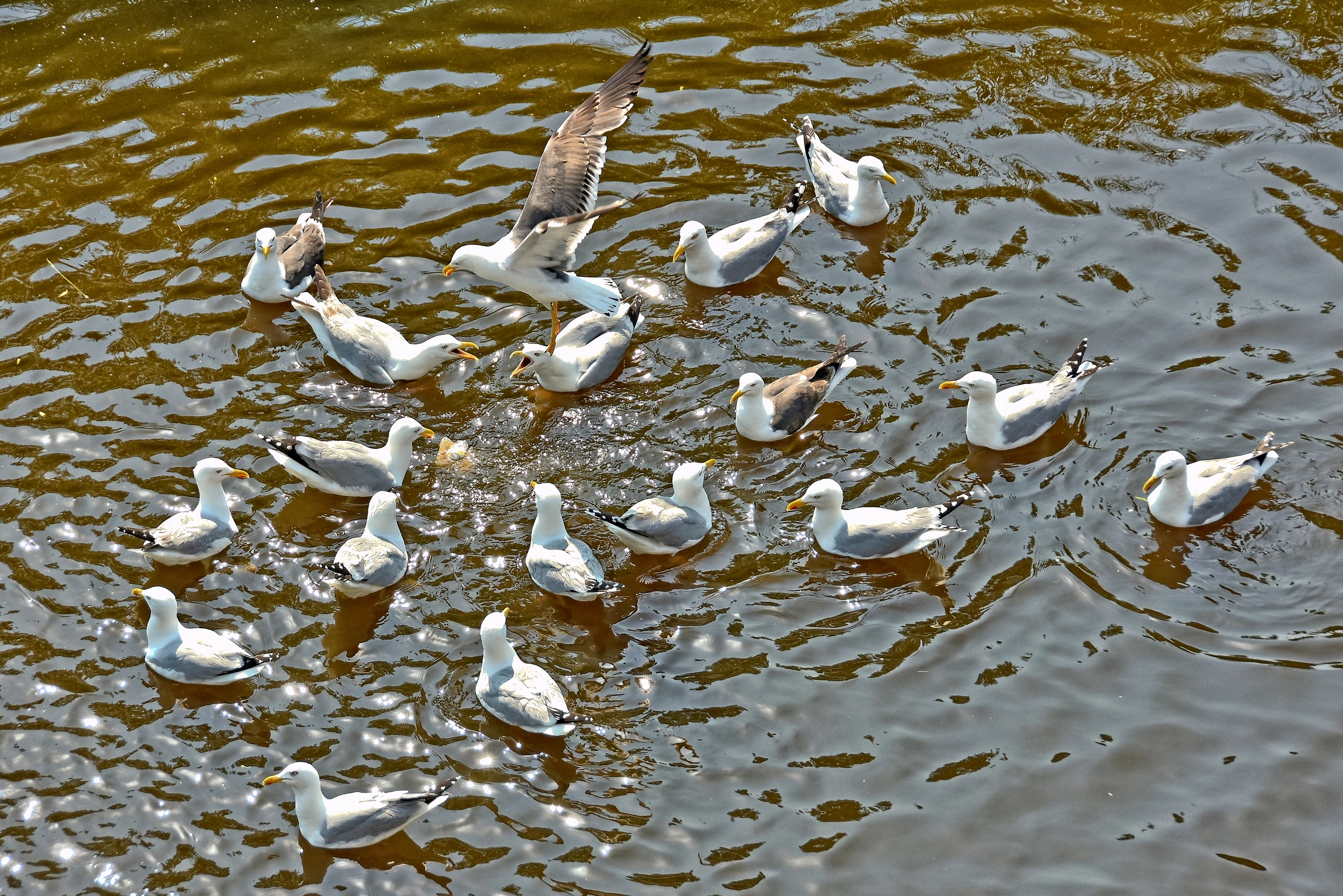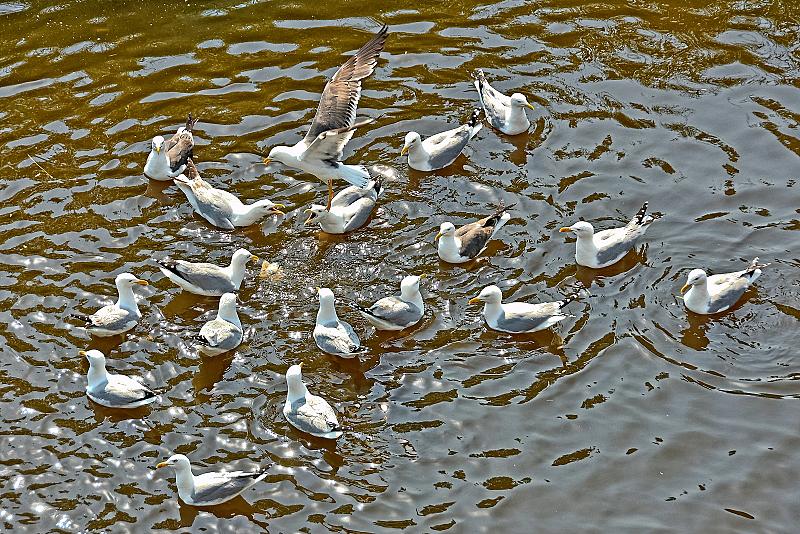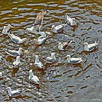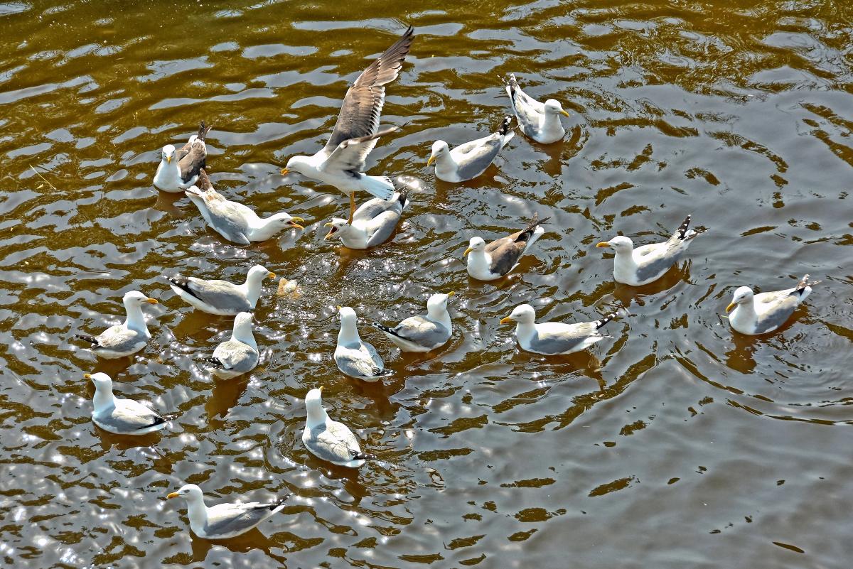 Meeuwen vechten onderling om een stukje brood