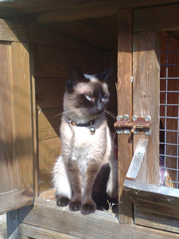 hier zit mijn kat bubbles lekker te genieten van de zon , in het hok van de cavia's
