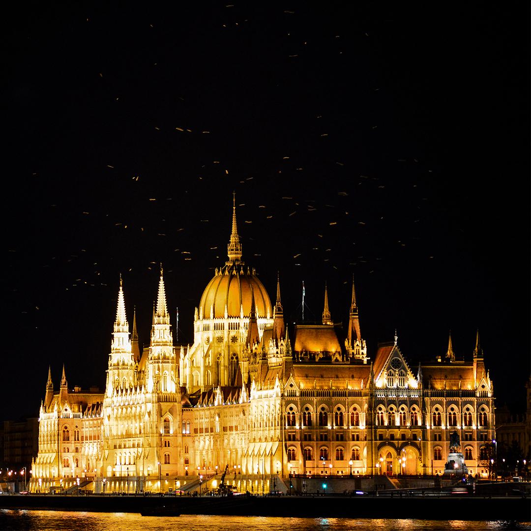 Foto van het parlementsgebouw aan de oevers van de Donau, Budapest, Hongarije. Mijn oog viel op de vogels die cirkelden boven het gebouw en die verlicht werden door de felle lampen die het gebouw deden stralen. Overigens is dit bouwwerk overdag zeker niet minder indrukwekkend, dus het is ongeacht de tijd van je bezoek een kijkje meer dan waard.