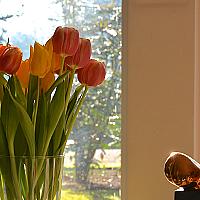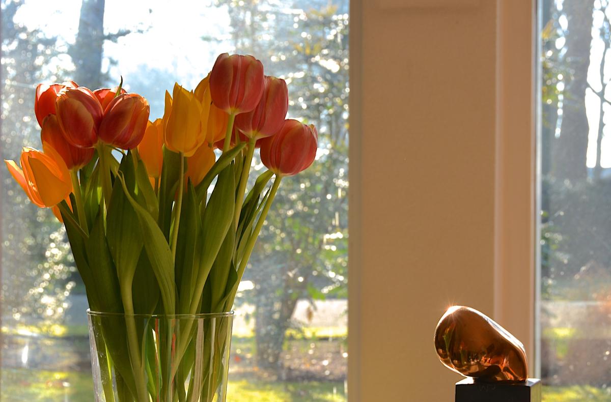 lentezon die mijn tuin buiten doet schitteren, de tulpen binnen doorschijnend maakt en in het brons van het beeldje reflecteert als een sterretje