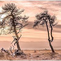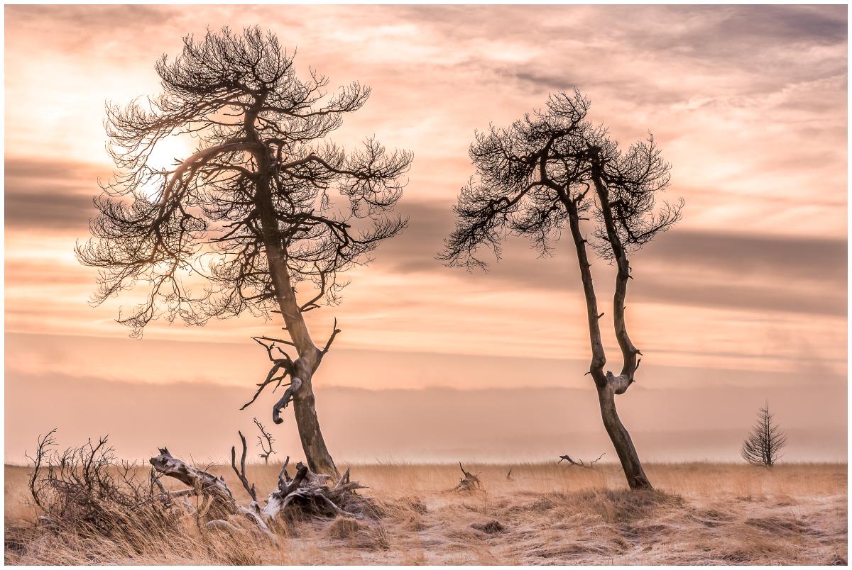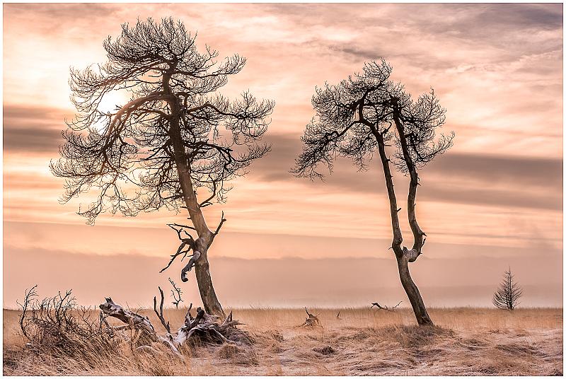 Deze dode dennenbomen staan op de hoge venen, het zijn de overblijfselen van een bos dat halverwege de 19de eeuw werd aangeplant. Door heidebranden werd het bos verwoest en de tand des tijds deed de rest. De verweerde aanblik van deze bomen zijn een paradijs voor landschapsfotografen.