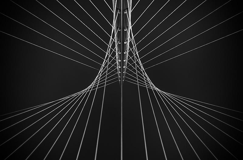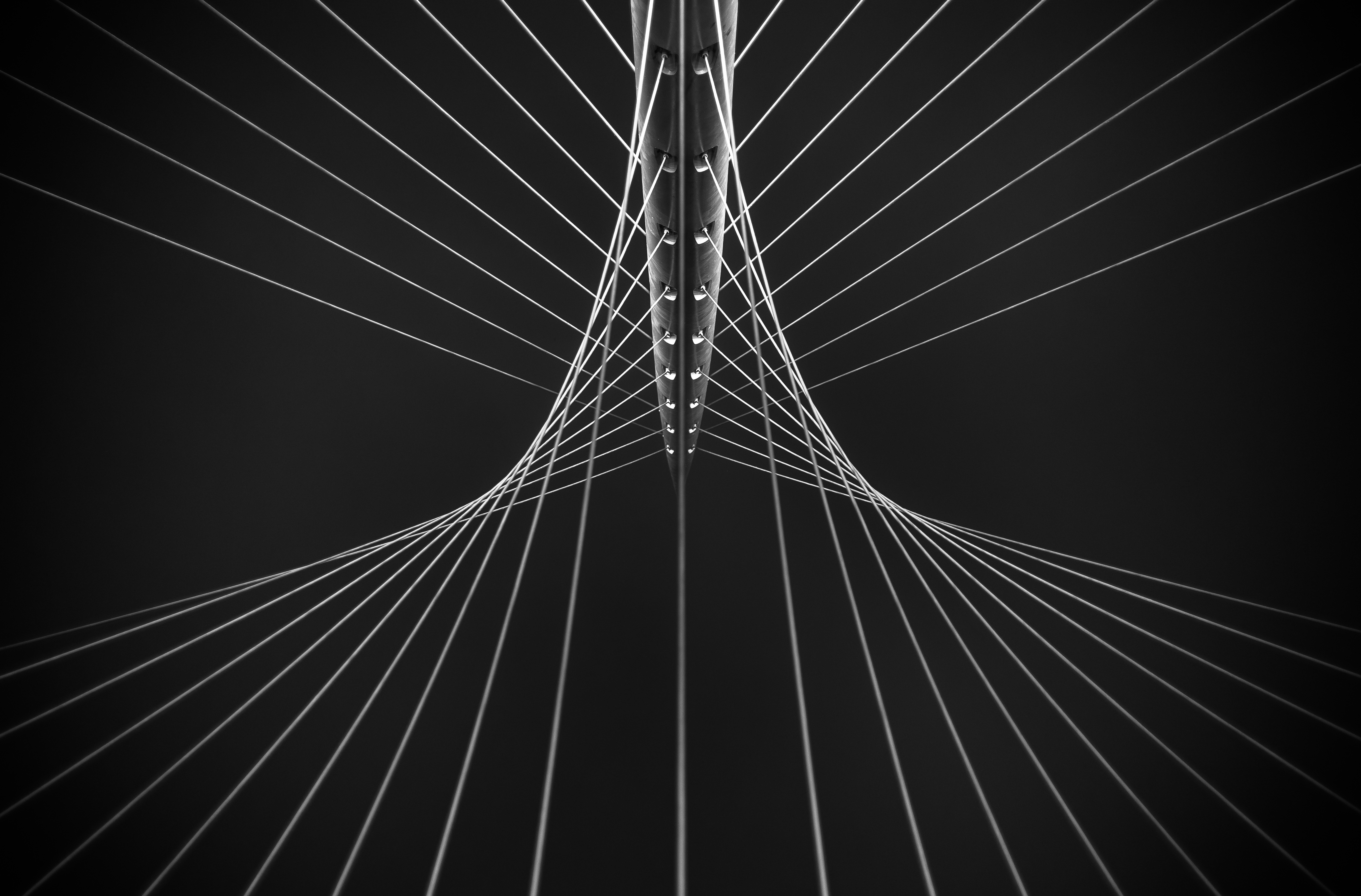 Dit is een foto van de Calatrava brug in Hoofddorp, dit is 1 van de 3 bruggen. Deze specifieke brug staat in het midden van een rotonde en bestaat uit een soort speer met kabels eraan vast. Ik heb dit perspectief zo kunnen creëren doordat ik met mijn camera recht onder het midden van de speerpunt ging staan, waardoor het een abstract gevoel krijgt met al die kabels. Het zwart & wit effect geeft het naar mijn mening een mysterieuzere look.