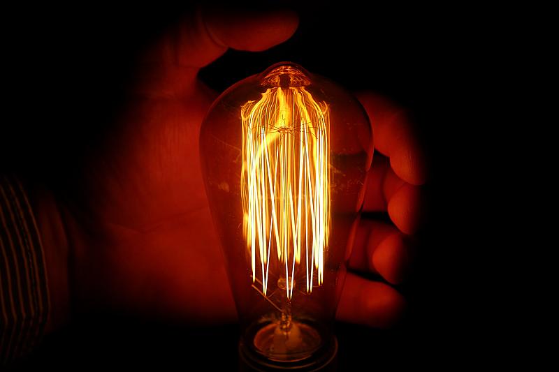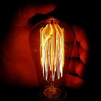 Foto van oudewetse gloeilamp in het donker genomen tegen een zwarte achtergrond. Het lijkt wel of de lamp in vuur en vlam staat.