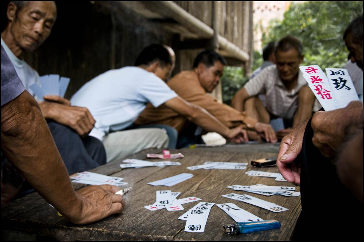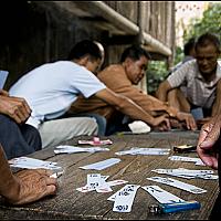 Hoewel reisfotografie 'an sich' al een hobby is, vind ik het helemaal mooi om de lokale bevolking kaartspelend, gokkend of weddend met elkaar vast te leggen. Ook hier in Chengyang hoefde ik daar niet lang naar te zoeken. Het was rondom etenstijd en er werd om serieuze bedragen gekaart. Ik merkte dan ook dat men eerst elkaars goedkeuring zocht toen ik mij met mijn camera laag in de hoek plaatste, om vanuit dit lage standpunt een kijkje te kunnen nemen in hun kaarten.