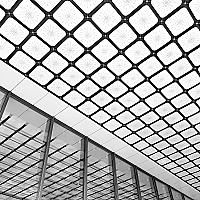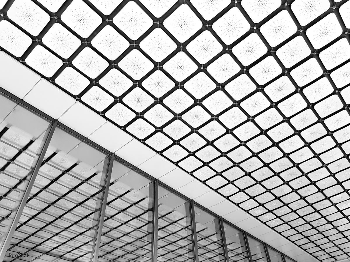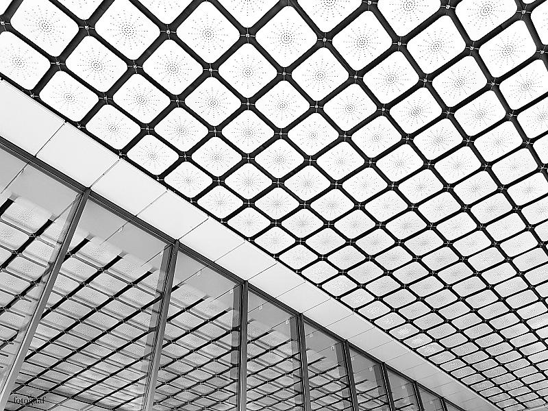 Dit is het plafond van het Museum van Beeld en Geluid in Hilversum. De afzonderlijke platen hebben -zoals het lijkt- een ingebouwde speaker, hoe toepasselijk. Kijk maar eens goed.