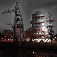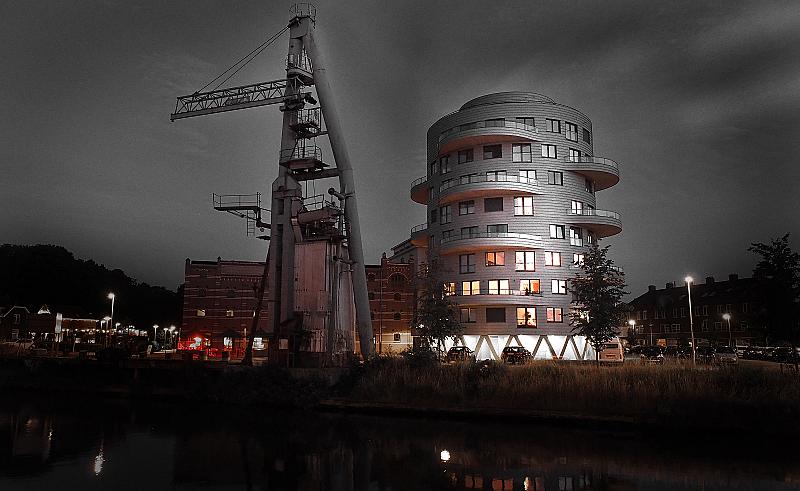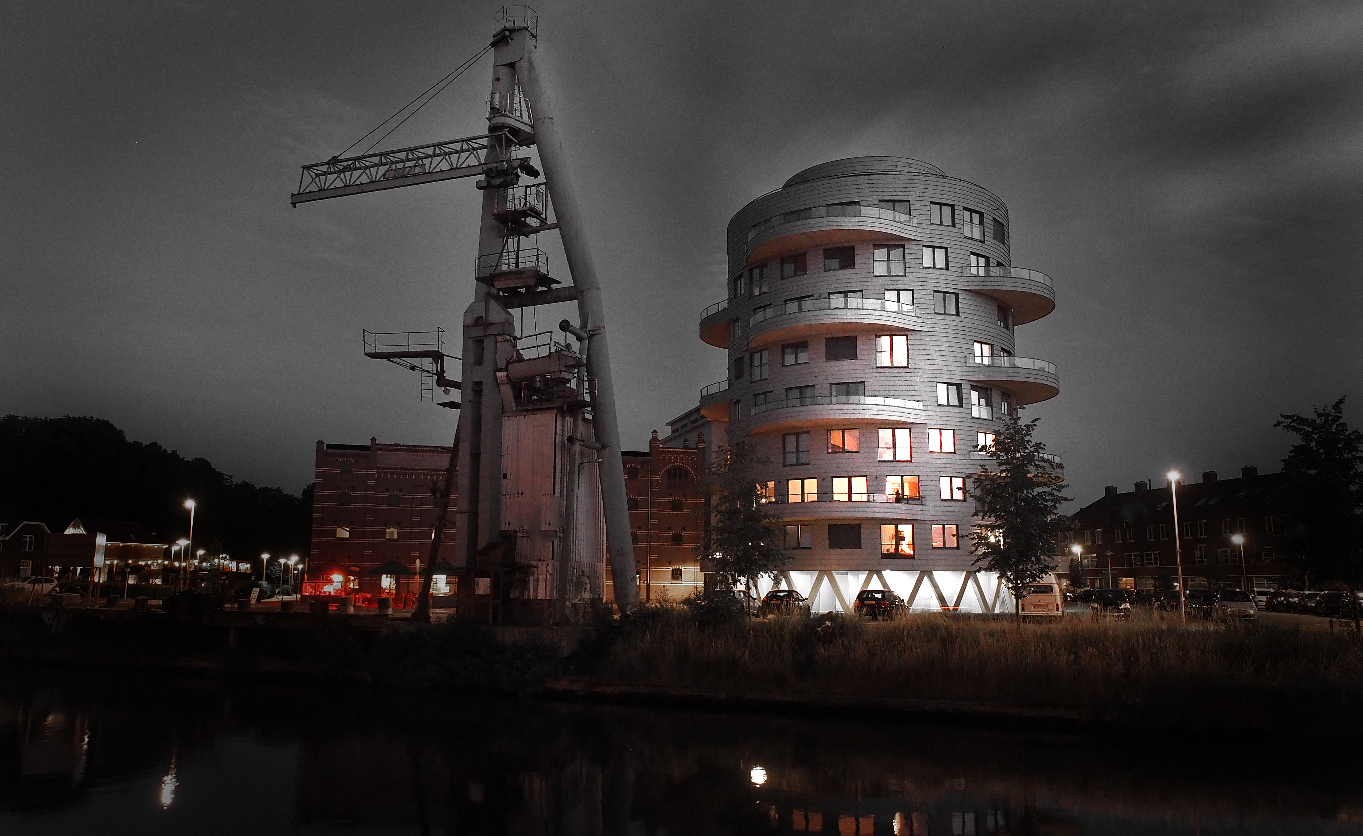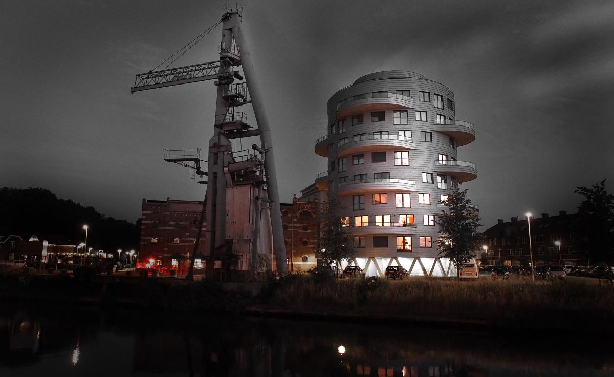 Moderne appartmenten op het terrein van de oude soyafabriek Cereol in Oog in Al, Utrecht. Met de elevator naast het gebouw werden vroeger de soyabonen van binnenschepen naar de fabriek getransporteerd.