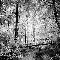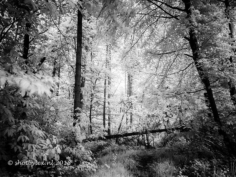 Het pad is geblokeerd, en overgroeit langzaam. Deze zwarte wit foto is gemaakt op een bewolkte grijze dag met gebruik van een Infraroodfilter. Dat geeft net een ander licht waardoor zwartwit opnames een vervreemde sfeer krijgen...