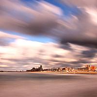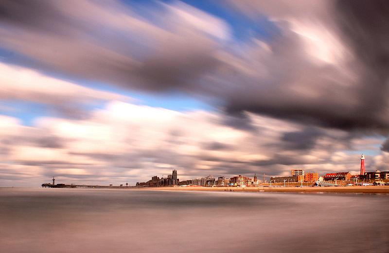 Long exposure, Scheveningen in het het zonnetje gezet tussen de wolken door.