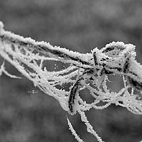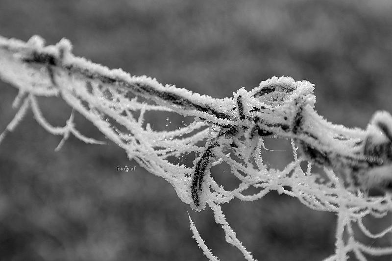 Een echt winters plaatje, de doorgaans onzichtbare spinnerag rond het prikkeldraad nu volledig zichtbaar door de afzetting van rijp.