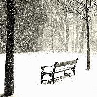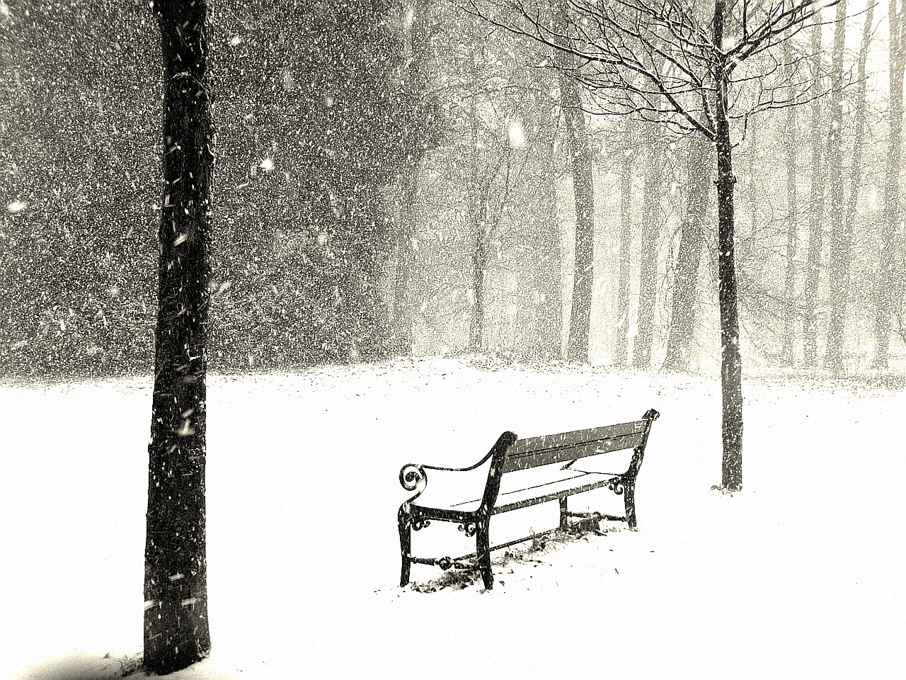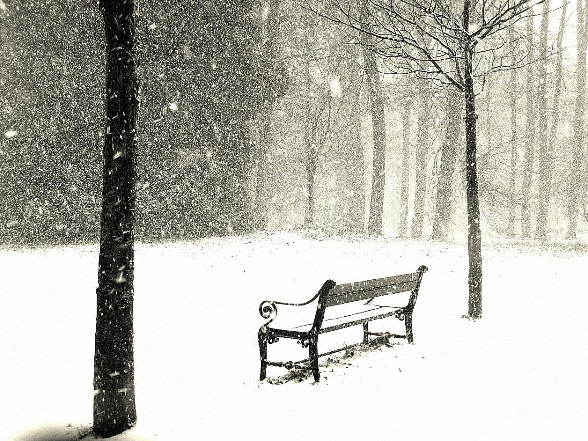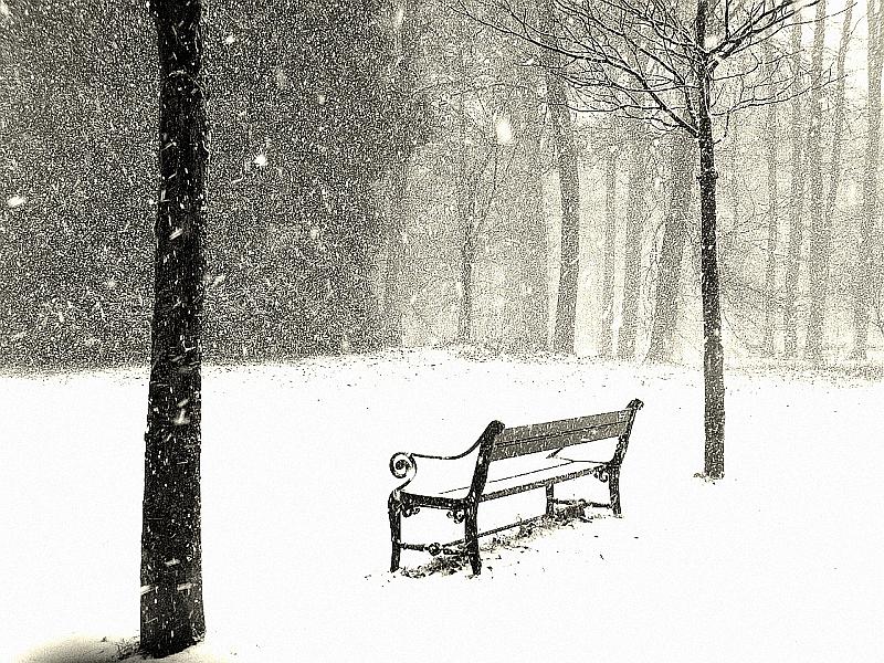 Midden in een sneeuwval was ik net zo koud en verlaten als dit bankje