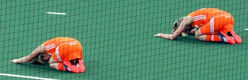 Deze dames van het Nederlandse hockeyteam bereiden zich voor op de halve finale van de Rabobank Hockey World Cup 2014.