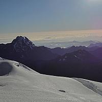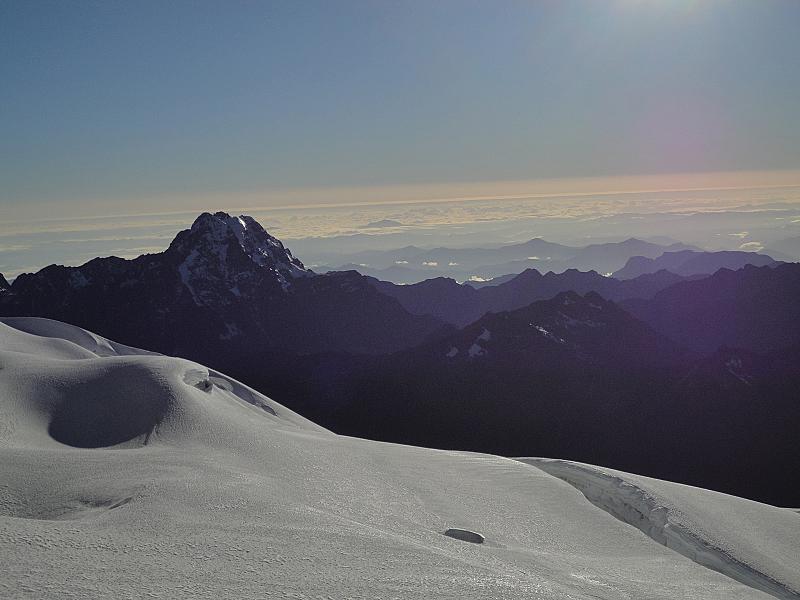 Bovenop de Huayna Potosi (6088m) kwam ik tot deze foto. De vroege ochtendnevel hangt nog tussen de lager gelegen toppen en na een loodzware tocht is er op deze plek niets anders te doen dan stil zitten en genieten...