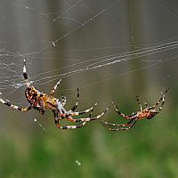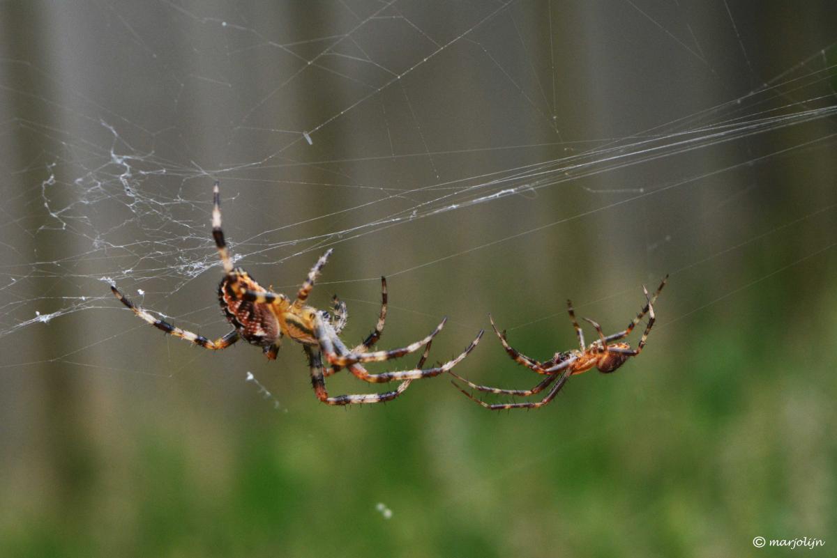 vrouwen het hof maken, een gevaarlijke bezigheid voor een spinnen-man... vooral omdat zíj een stuk groter is! (na het maken van een paar van deze foto's heb ik hem dus niet meer terug gevonden.. zíj hangt er nog wel)