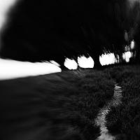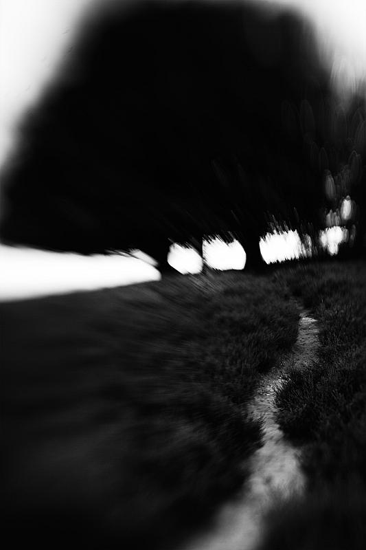 Een pad over de heide, verderop een groepje bomen. Geschoten met een lensbaby composer.