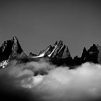 Drie van de Aiguilles van Chamonix torenen hoog boven de wolken uit.