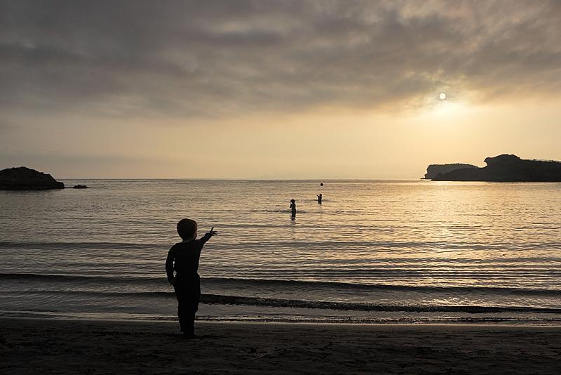 Kinderen die op aan strand enin de zee met een bal spelen.