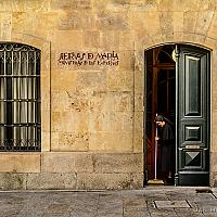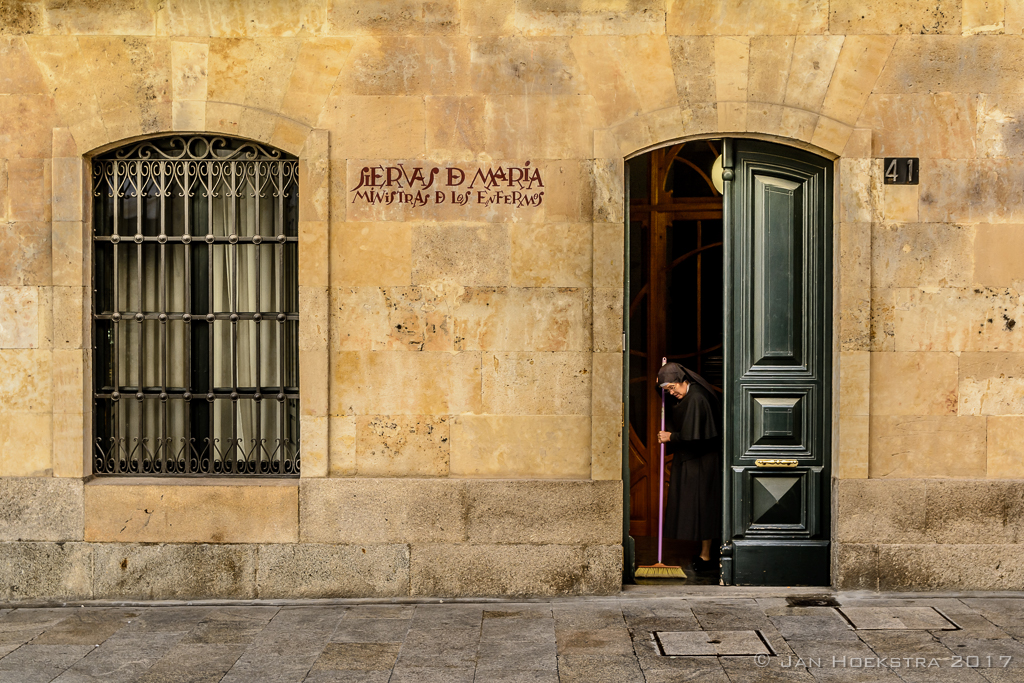 Gemaakt in Salamanca, Spanje 1-mrt-2017. Bij toeval zag ik de zuster/non in de deuropening staan met de bezem toen we langsliepen.