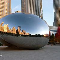 Foto van "The Bean" in het Millenniumpark te Chicago. De foto is gemaakt in het licht van de opkomende herfstzon