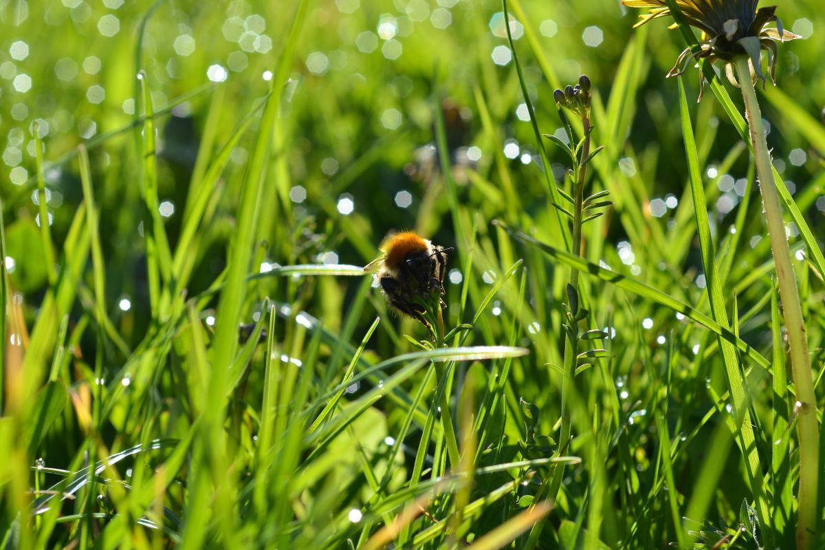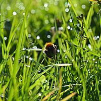 Na een nacht met regen en kou probeert deze hommel een droog en warm plekje te zoeken. Met moeite weet hij zich vast te houden aan de pinksterbloem.