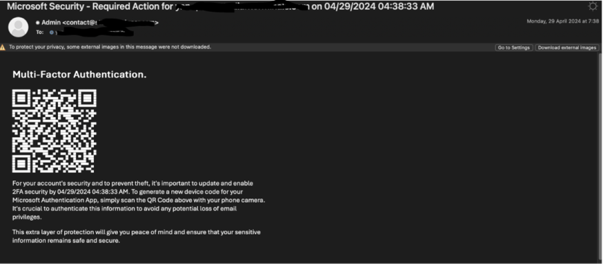 Voorbeeld van e-mail met een herauthenticatie verzoek. Achter de QR-code zitten ASCII-tekens, die niet als afbeelding worden herkend door beveiligingssystemen.
