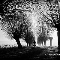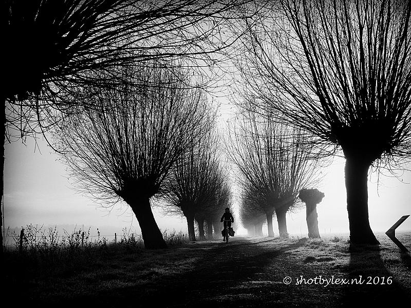 Fietser op een koude, mistige morgen