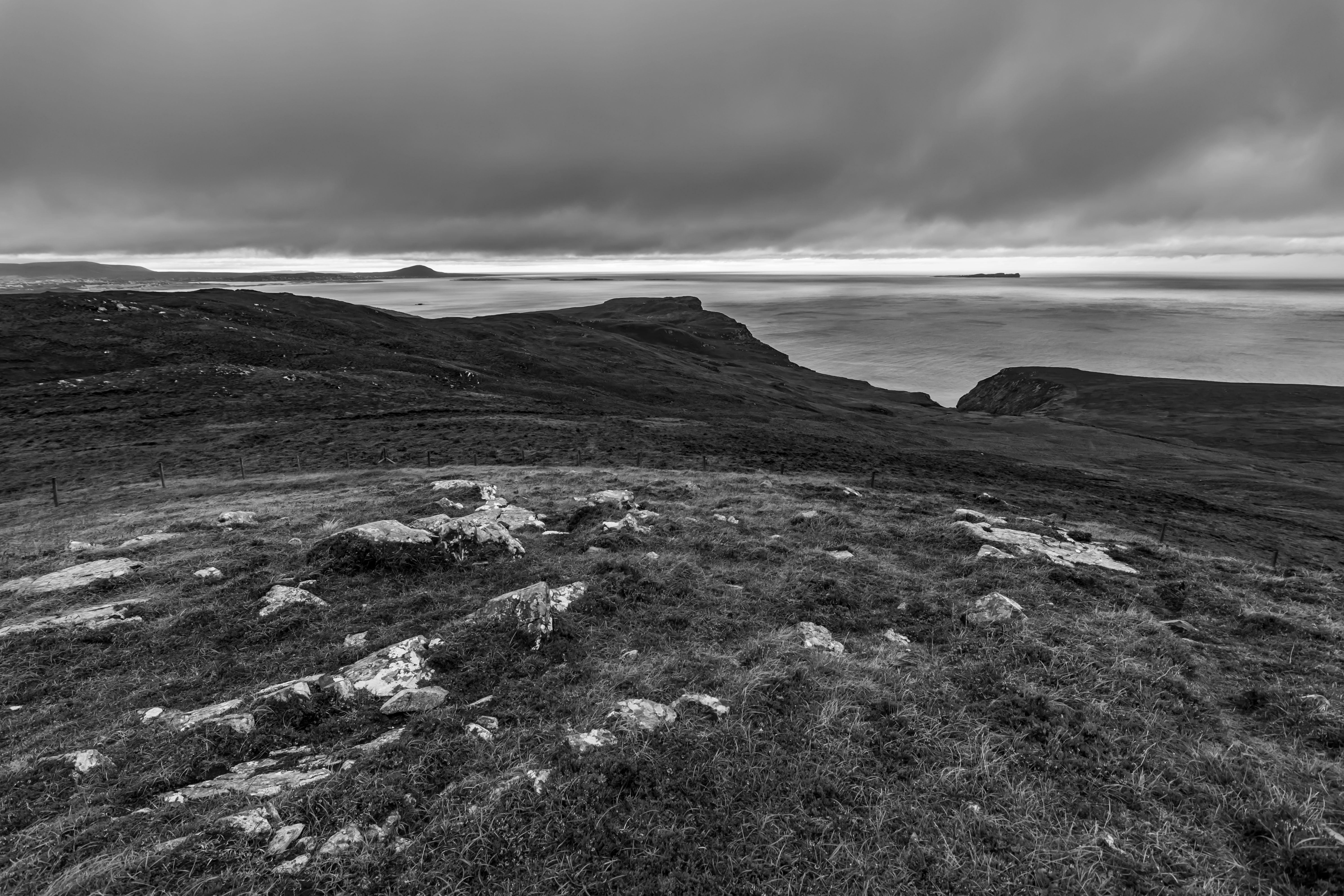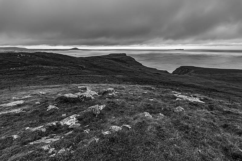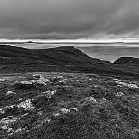 Dit is een foto die ik afgelopen zomer op vakantie in Ierland nam. Door de ruige natuur met afwisselende lichte en donkerdere tinten en de dreigend uitziende lucht, vond ik deze plaat bij uitstek geschikt om in zwart-wit te laten zien. De streep heldere lucht aan de hemel versterkt het contrast met de donkere rotsen.