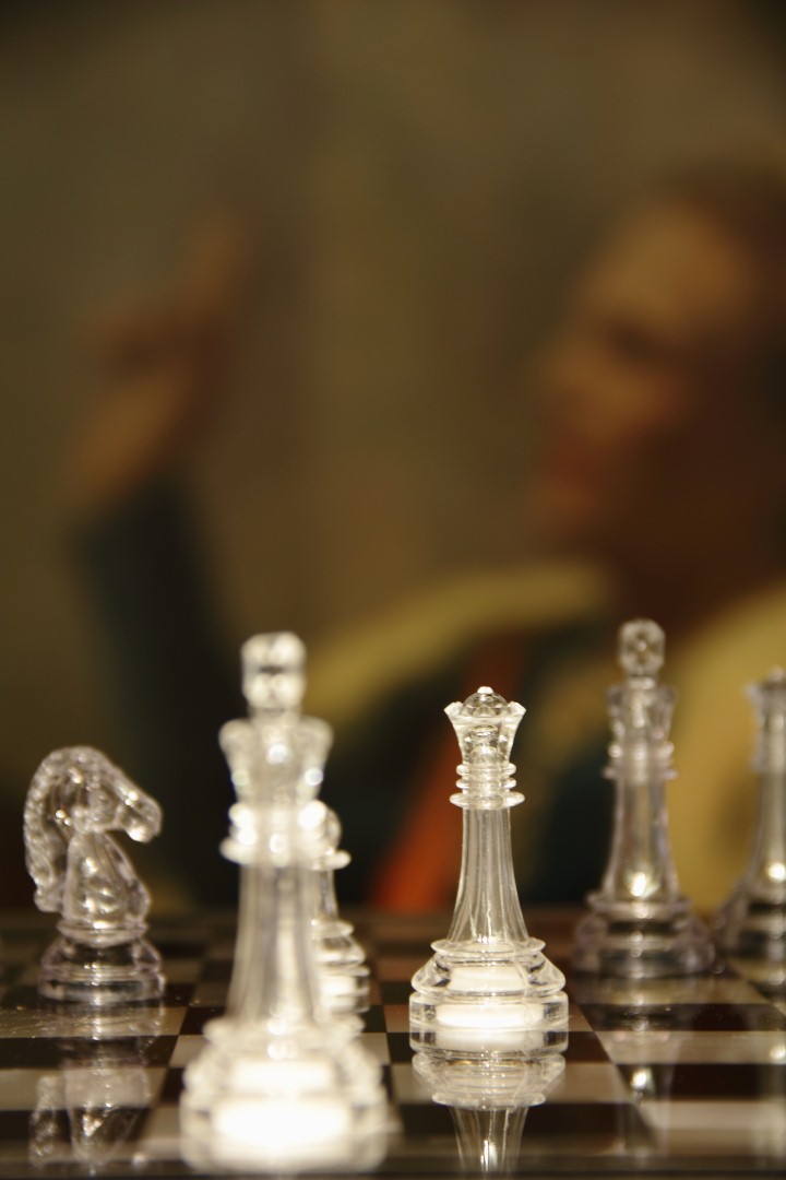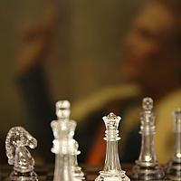 Schaakspel met op de achtergrond het schilderij van de beëdiging van koningin Wilhelmina.