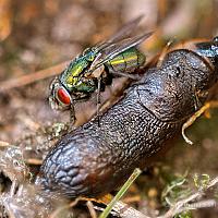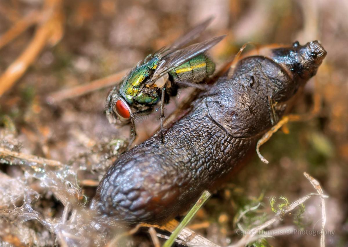 De strontvlieg en de dode naaktslak..wel kleurijk.