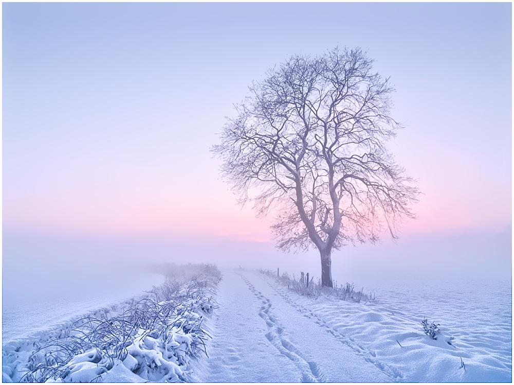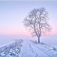 Een mistig winter landschap, een eenzame boom en de voetsporen van een man en zijn hond in de sneeuw.