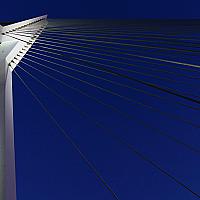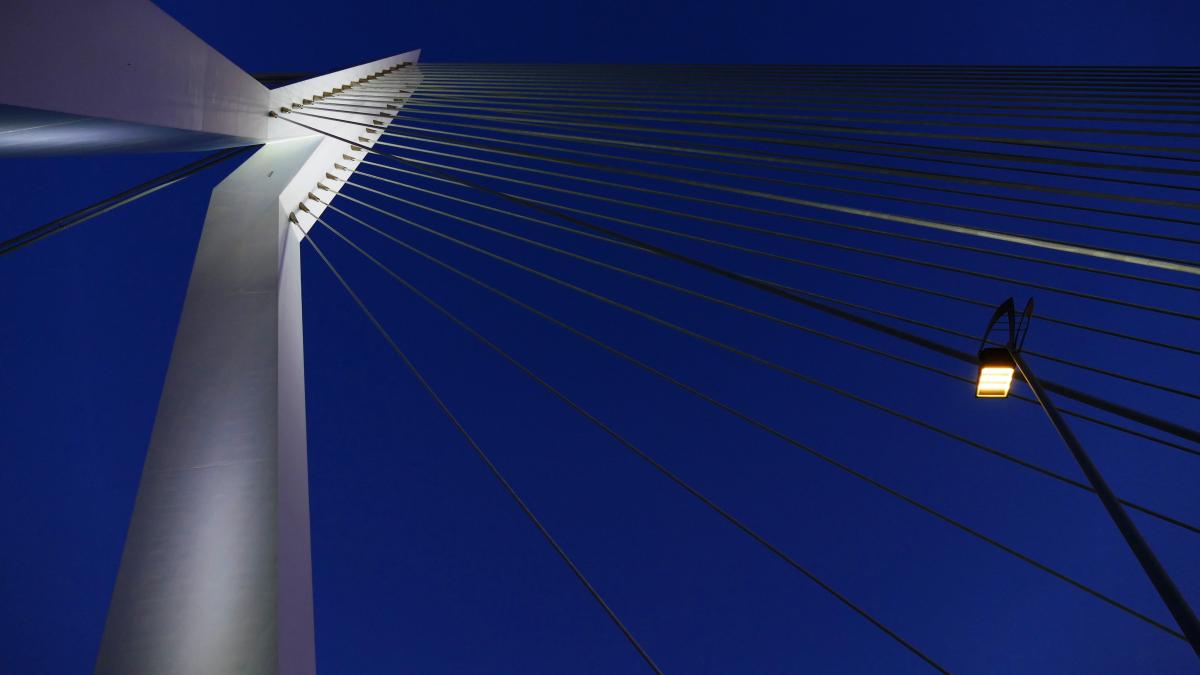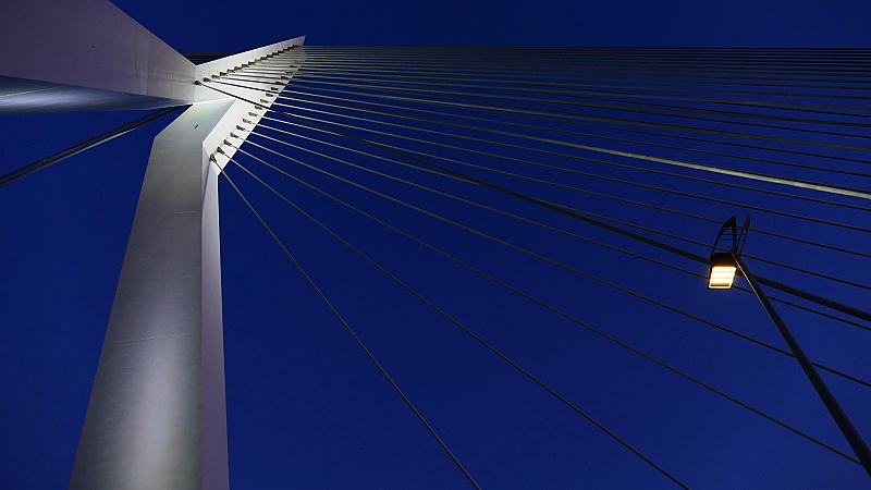 De Erasmus brug in Rotterdam. Gefotografeerd in een hoek dat de baleinen evenwijdig lopen aan de kader.