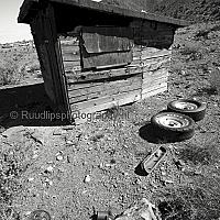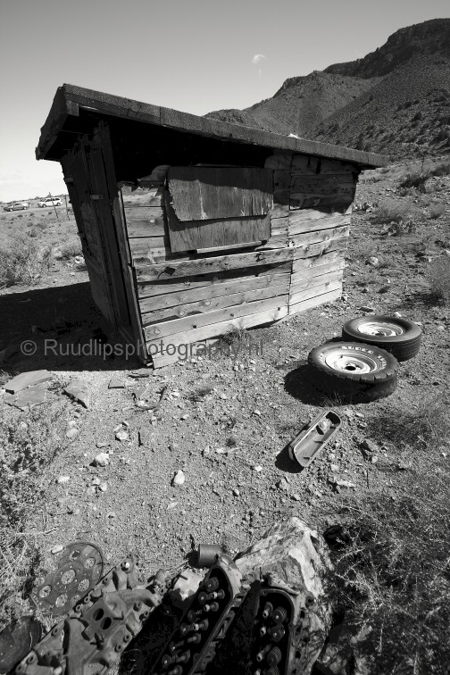 In de woestenij van Utah, Mojave gebied, stond dit verlaten oude houten huisje.