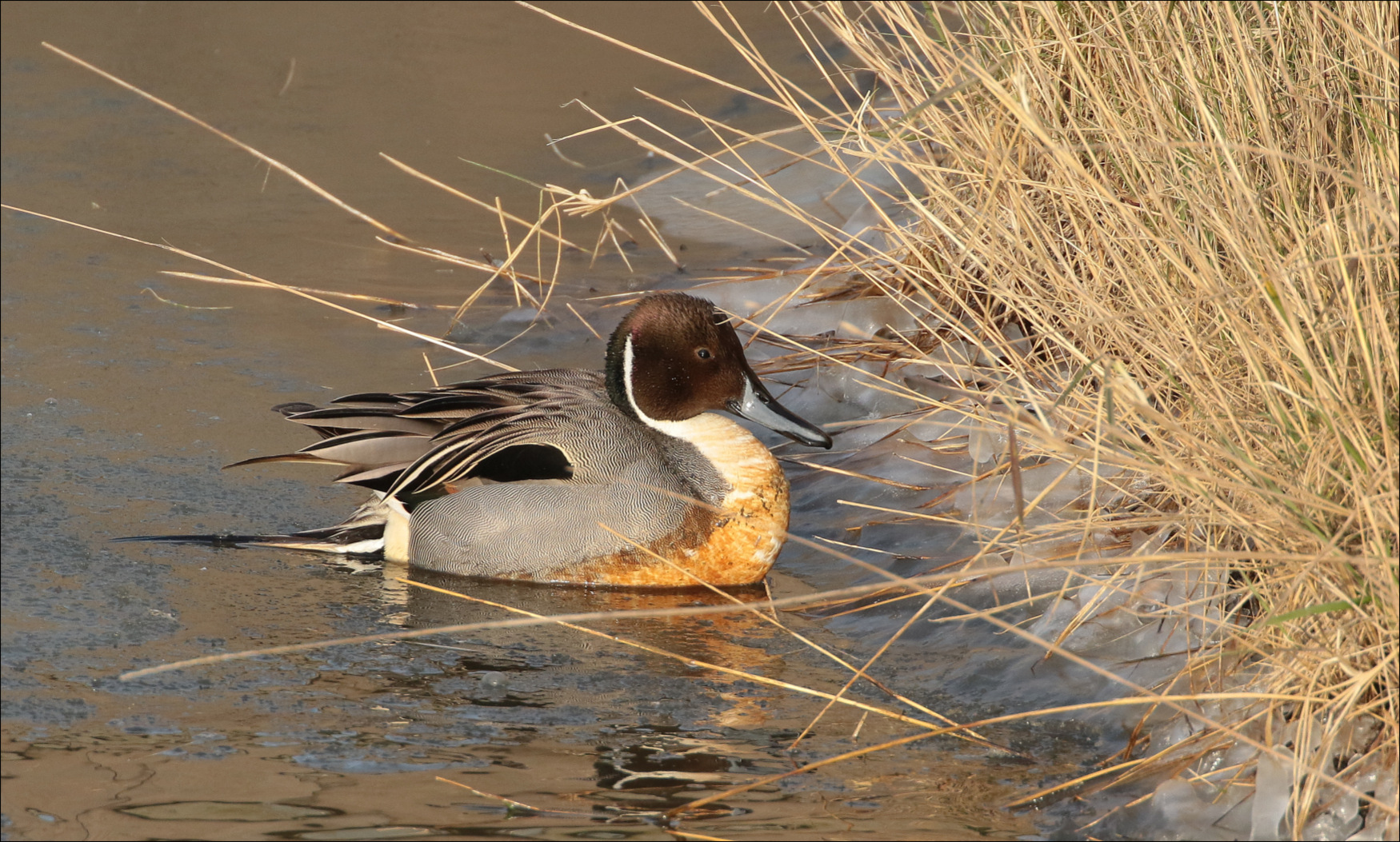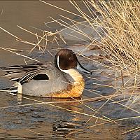 Pijlstaart dobbert langs de rietkant.Vanuit de auto gemaakt.