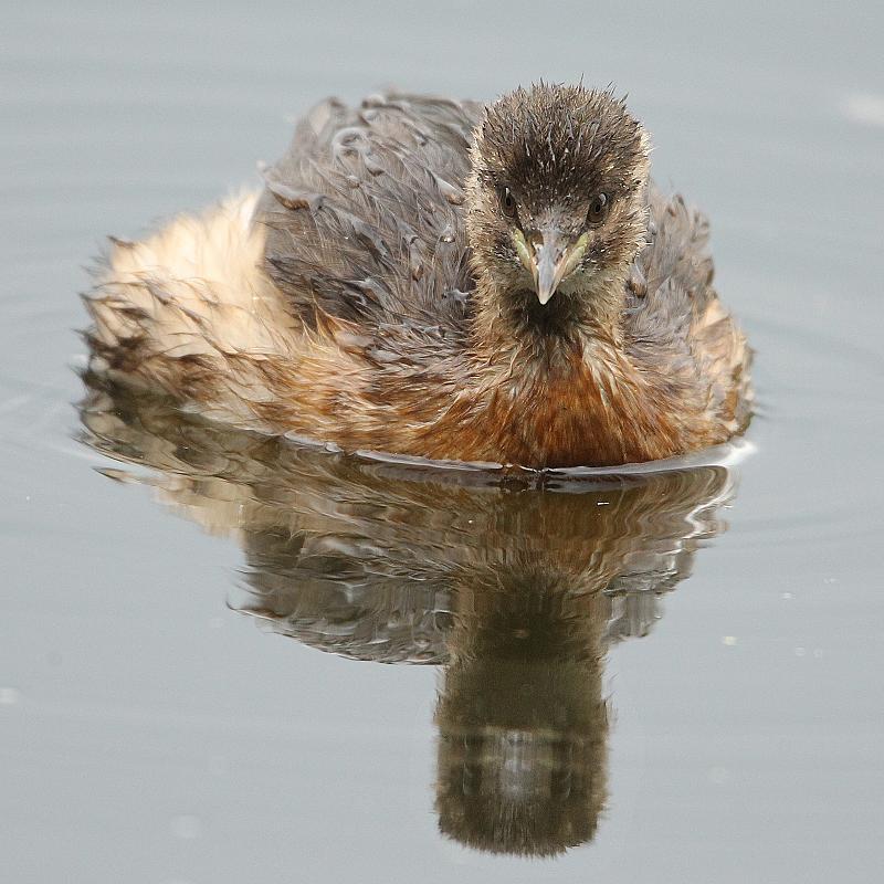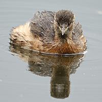 Jonge dodaars kijkt in de pauze van het vissen even naar de fotograaf en wordt mooi gespiegeld in het stille water.