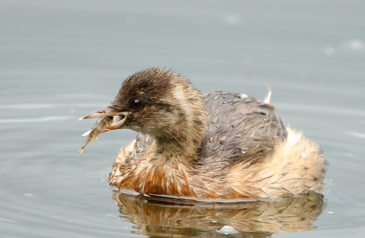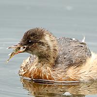 Jonge dodaars heeft net zelf een stekelbaars gevangen. Nu moet hij nog in de goede richting naar binnen!