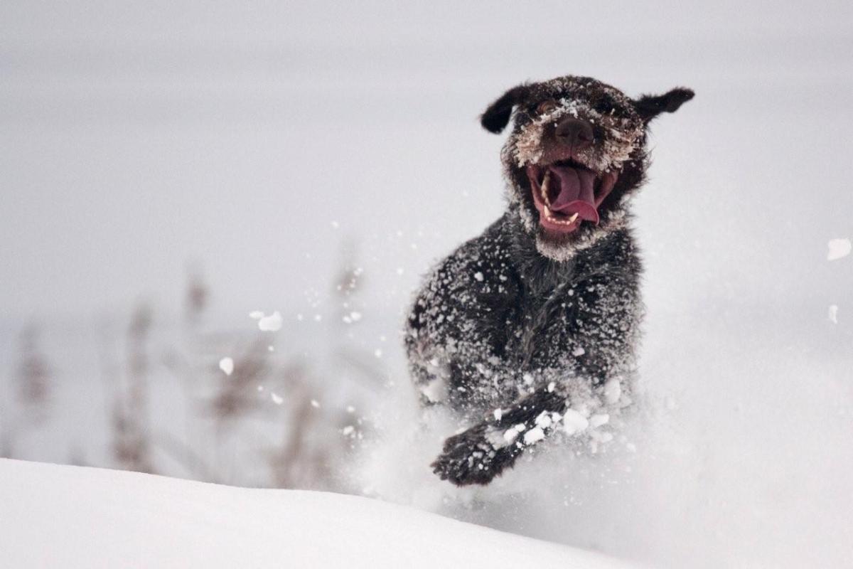 draadhaar aan het genieten in de sneeuw