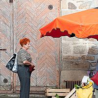 In het plaatsje Bourganeuf in Frankrijk is er iedere woensdag markt. Het viel me op dat de vrouw een oranje kapsel had, iets wilde kopen bij een kraam met een oranje parasol en dat alles gelegen voor een oranje deur. Dat kon niet ongefotografeerd blijven.