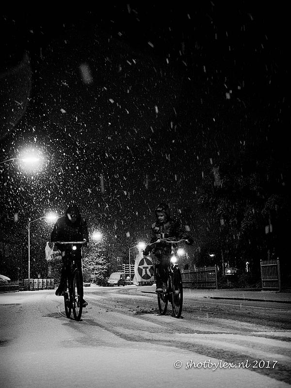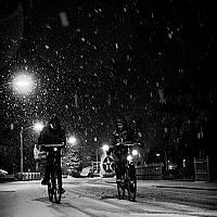 Fietsers trotreren de eerste serieuze sneeuwbui van deze winter...