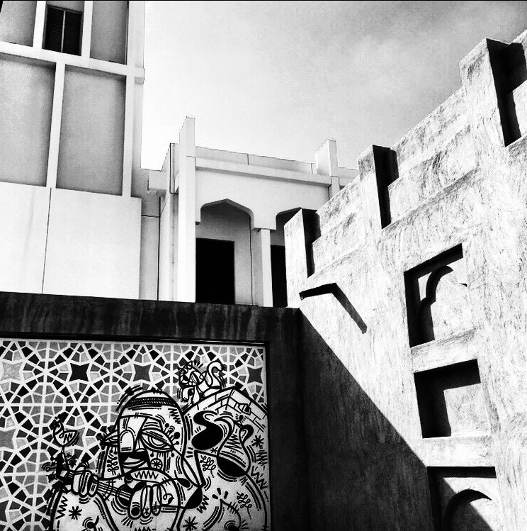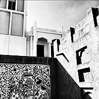 Mooi traditioneel gebouw met mozaïek kunstwerk op de muur. Groot contrast.