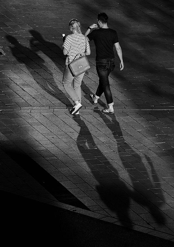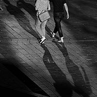 Zojuist genomen. De zon weerkaatst in een winkelraam, zodat je dubbele schaduw krijgt.