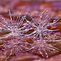 Bedauwde pluisjes drijvend op water.