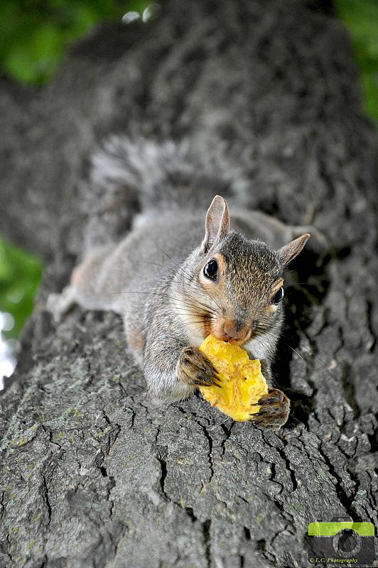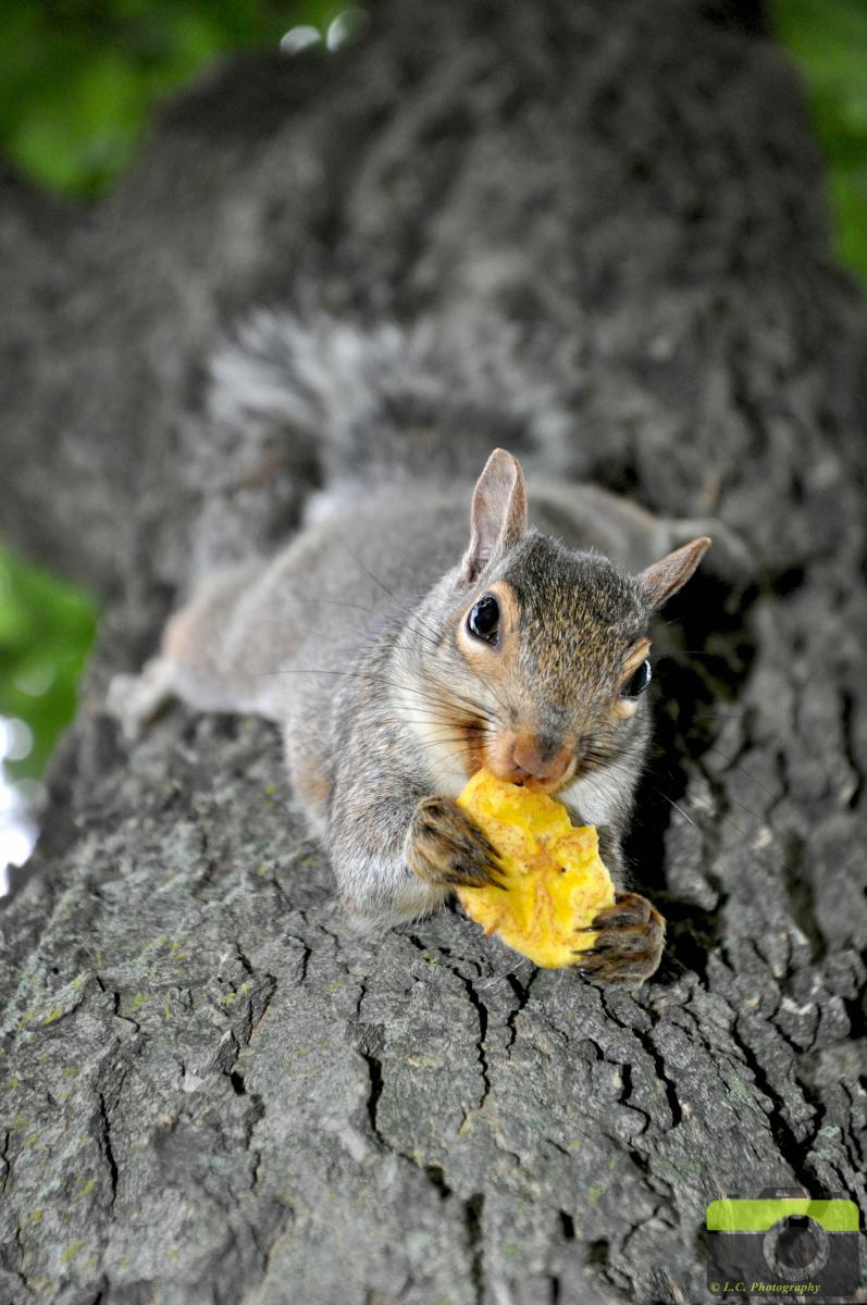 We waren met mijn familie op bezoek in Canada bij vrienden die vroeger in België woonde, wanneer we bijna naar huis gingen zijn we nog 2 dagen in Montreal geweest. Hier hadden we afgesproken met een collega van mijn moeder die met ons naar een park ging waar er veel van deze leuke eekhoorns zaten. Mijn broer en ik kochten bananen chips en gaven deze aan de beestjes. Wanneer we door gingen zag ik dat 1 van de eekhoorns ondersteboven op een boom hing met die chips, ik nam rap mijn camera en maakte enkele foto's van hem.
