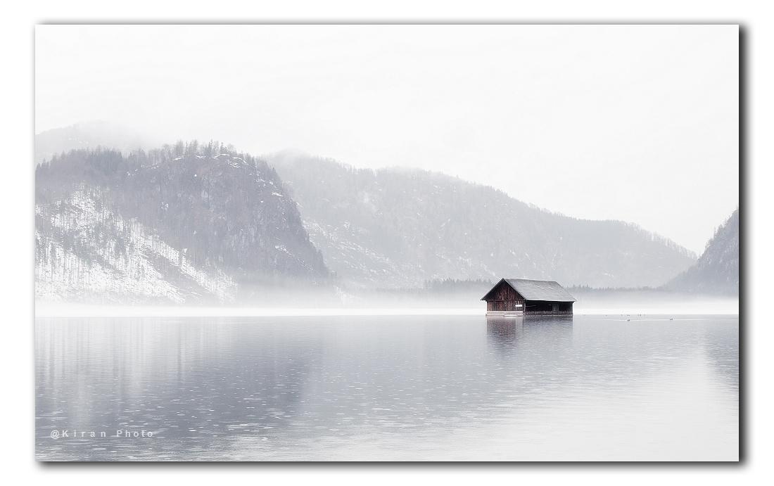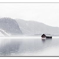Een drijvend huisje op een mistig meer