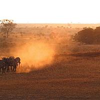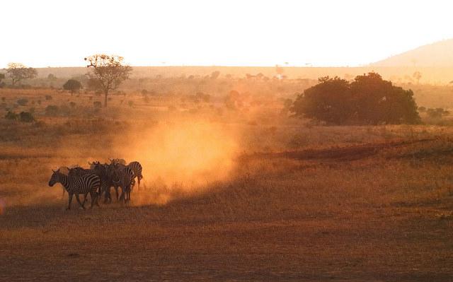 Een kudde zebra's bij zonsopkomst in Tsavo West