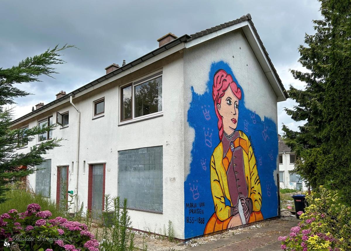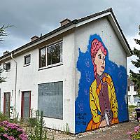 Deze leegstaande woonwijk in Dordrecht nodigt uit tot heel wat creativiteit. Een muurschildering op een hele zijgevel.