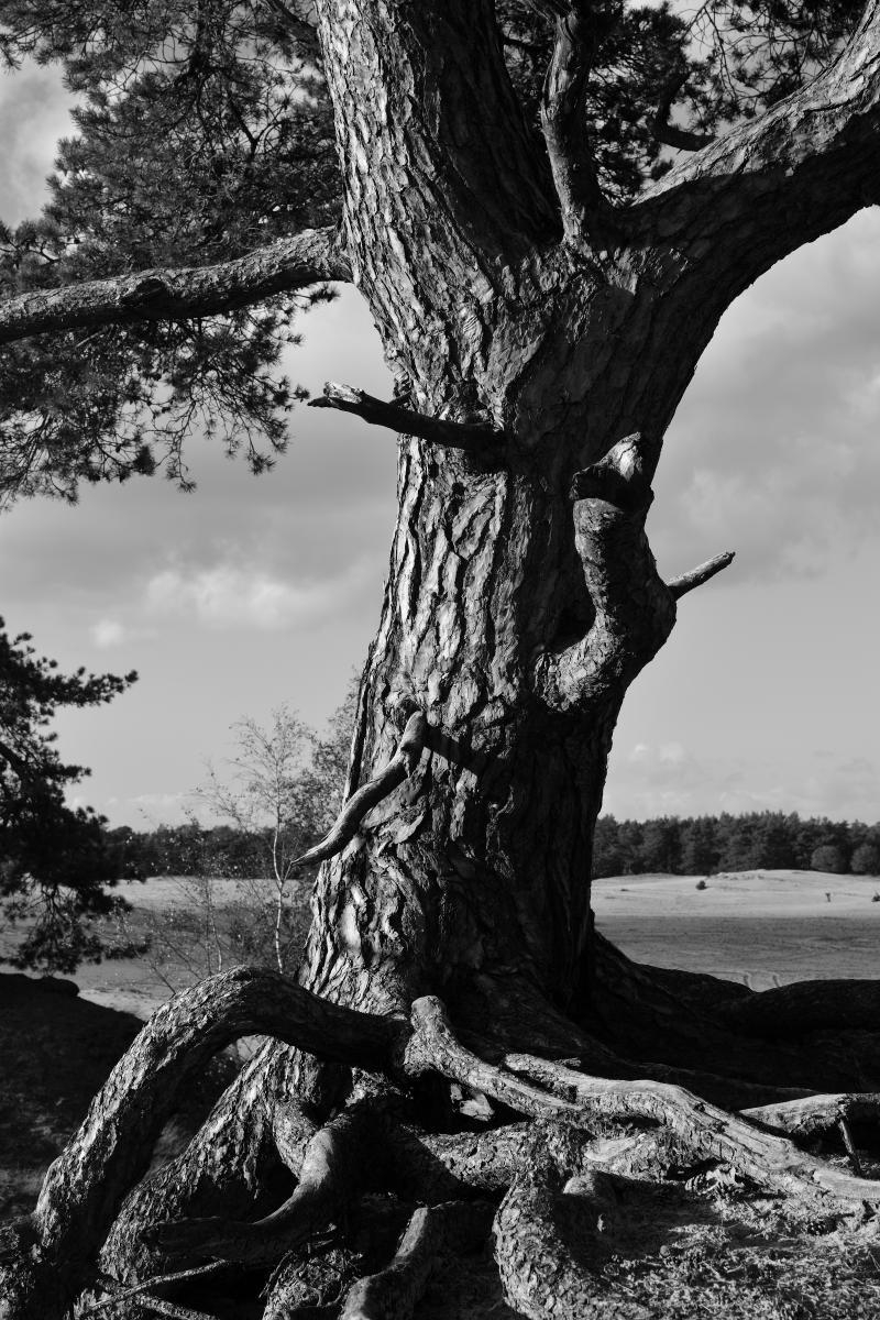 Deze foto van een grove den heb ik op de Beekhuizerzand bij Harderwijk gemaakt. Ik heb er voor gekozen om alleen de stam met wat wortels te fotograferen. Ik heb ook ervoor gekozen om de foto om te zetten nar zwart-wit.