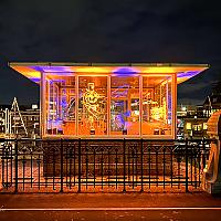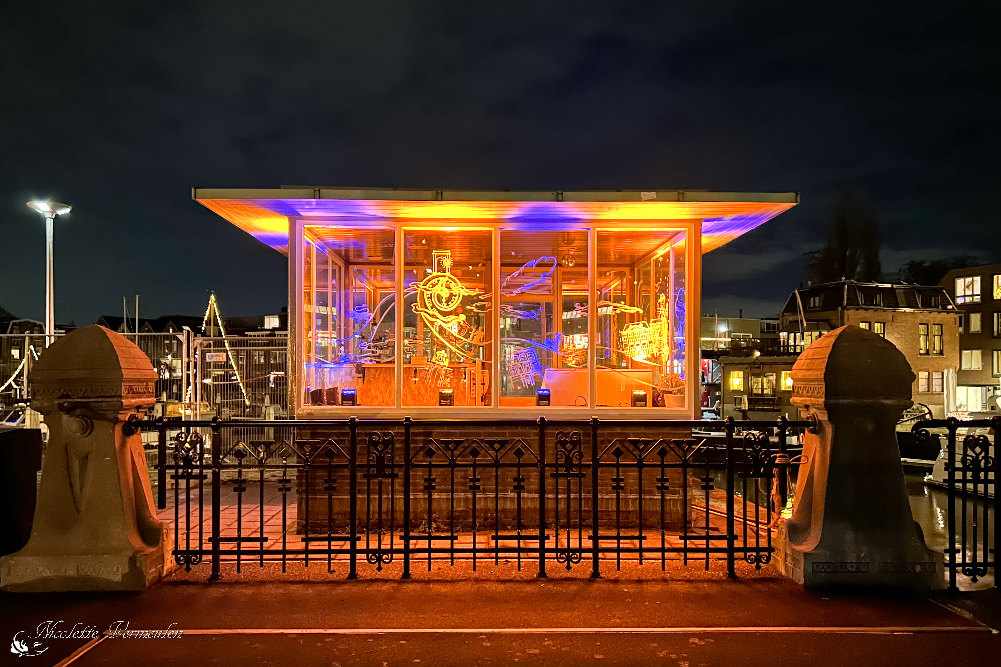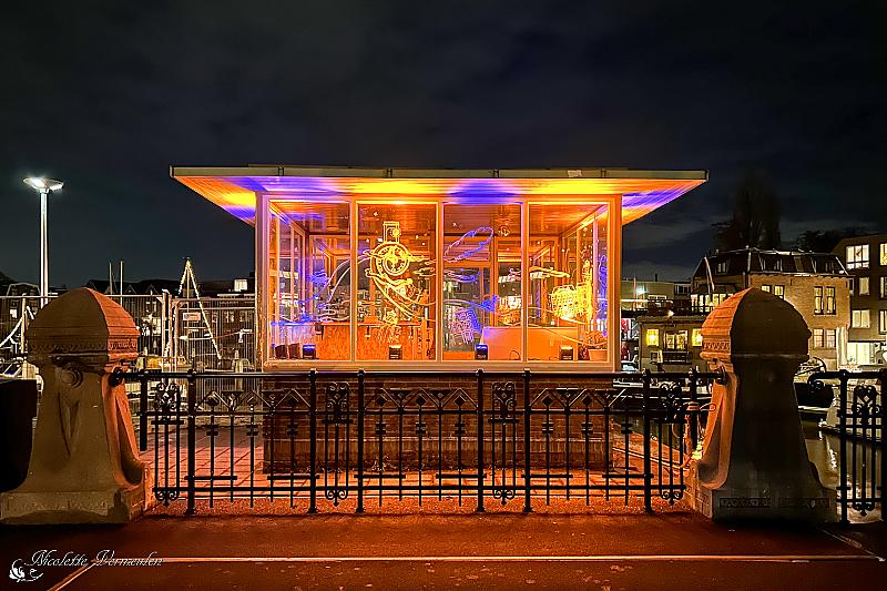 Een verlicht brugwachtershuisje in Dordrecht
