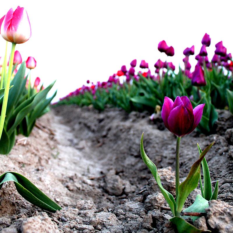Eenzame tulp, tussen de tulpen op het Flakkeese akkerland. Schitterend om losstaande tulp te zien staand in de duidelijk zichtbare de structuur van de grond.