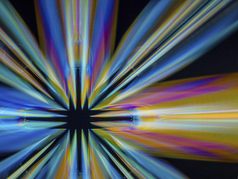 De techniek die ik gebruik is photo elacticity, de lens is ingezoomd op 8 doorzichtige vorken die tussen 2 gepolariseerde filters zijn geplaatst.