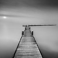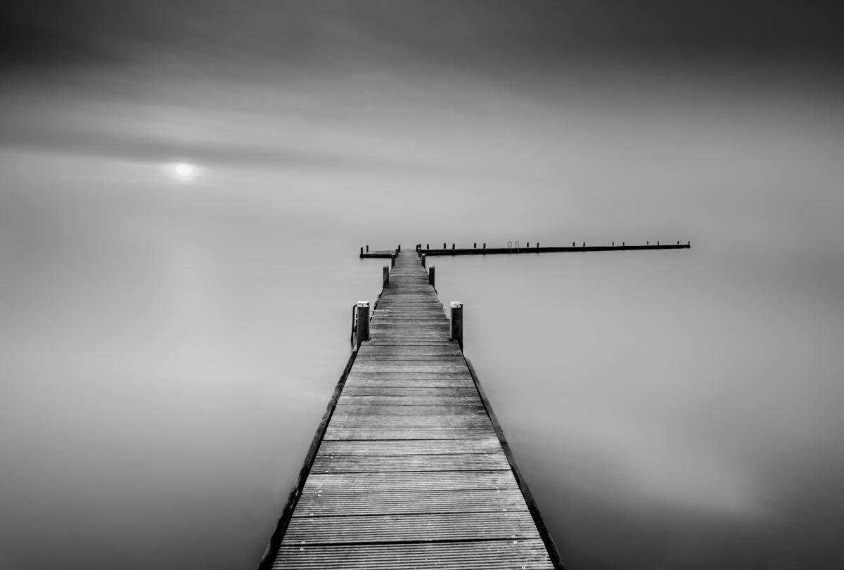 Foto van een steiger aan de Reeuwijkse plassen. De lange sluitertijd en het weghalen van de horizon geeft een beetje abstract en zweverig effect op de steiger.