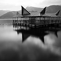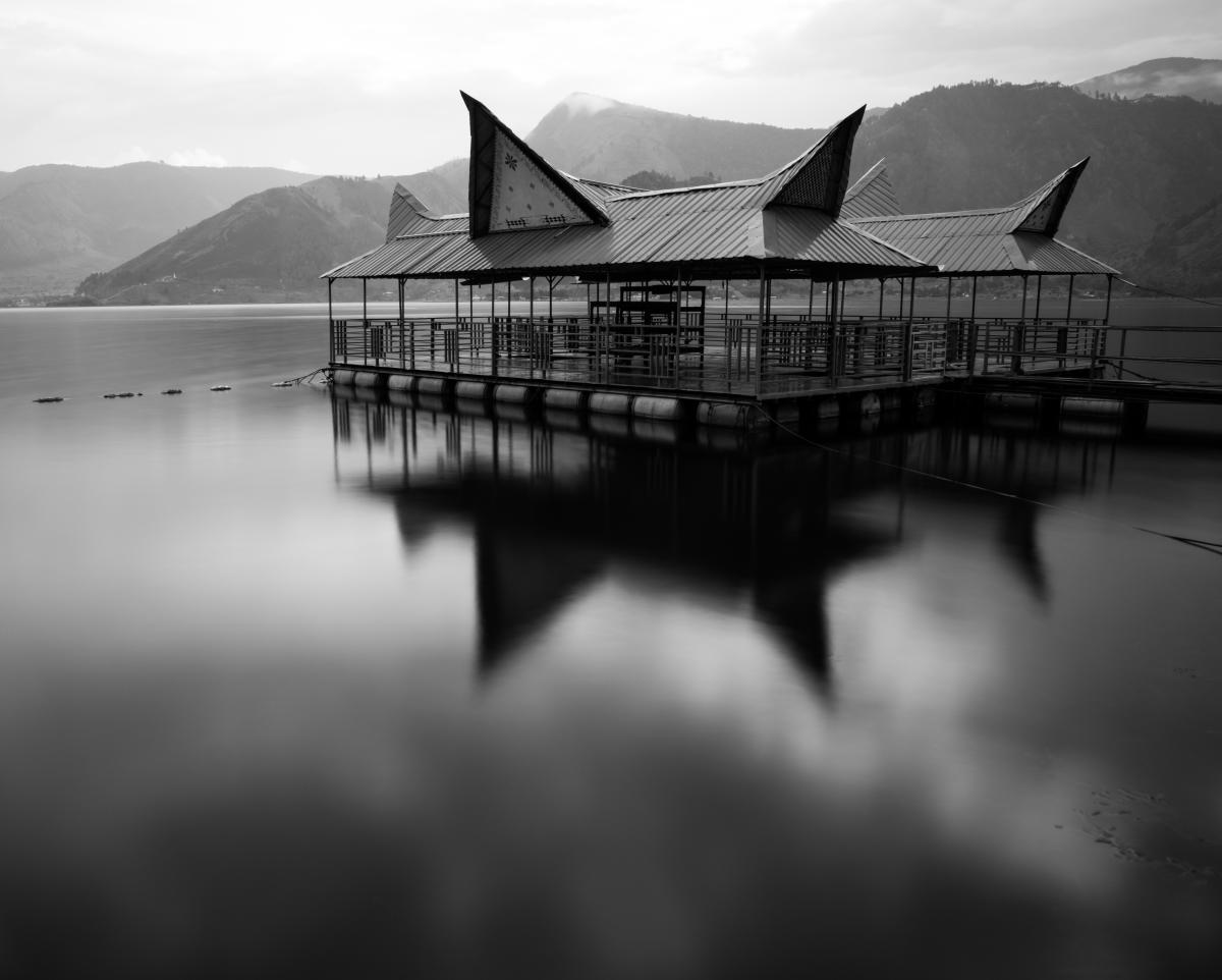 Drijvend bouwwerk op het Toba meer, Sumatra.